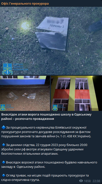 Офис генпрокурора сообщает, что под Одессой вследствие атаки "Шахедов" пострадало здание школы.