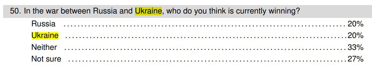 Также увеличилось количество тех, кто считает, что Россия побеждает в войне - с 17 до 20%. Этот показатель сравнялся с долей тех, кто уверен, что выигрывает Украина.