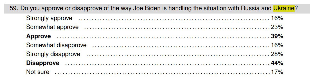 На три процента выросло число недовольных действиями Байдена по Украине - до 44%.