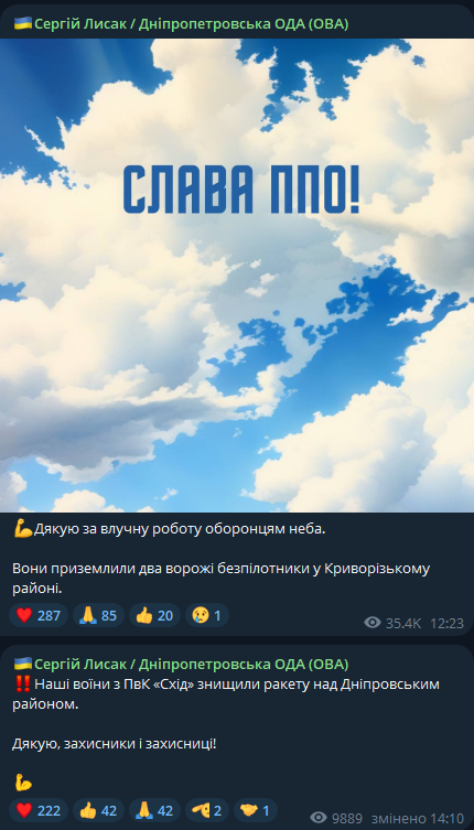 Также сегодня силы ПВО уничтожили ракету над Днепровским районом и сбили два беспилотника над Криворожским районом, сообщил глава Днепропетровской ОВА Сергей Лысак.