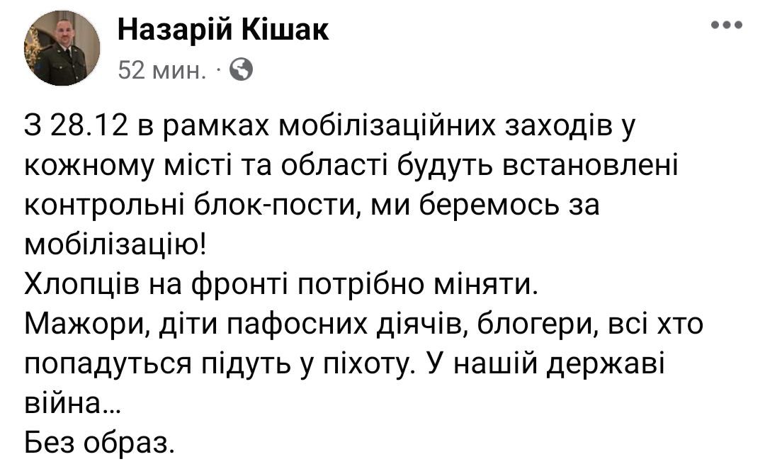 "С 28.12 в рамках мобилизационных мероприятий в каждом городе и области будут установлены контрольные блок-посты, мы беремся за мобилизацию", - написал он.