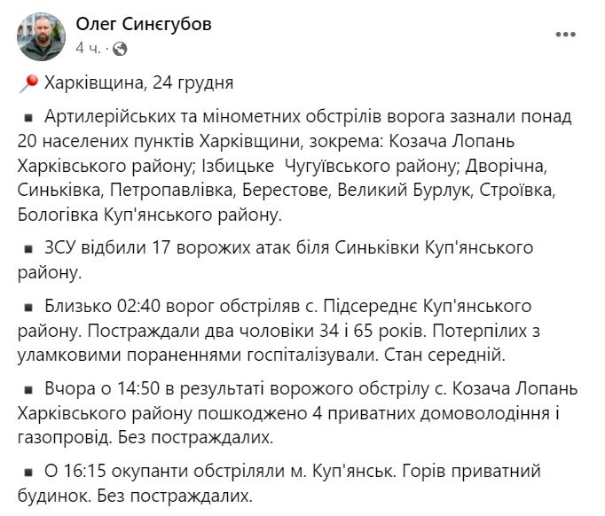 "Около 02:40 враг обстрелял с. Подсреднее Купянского района. Пострадали два человека 34 и 65 лет. Пострадавших с осколочными ранениями госпитализировали. Состояние среднее", - написал он.