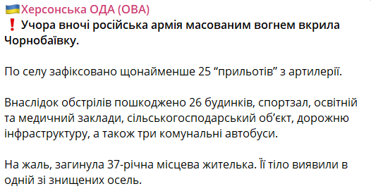 Вчера вечером российская армия обстреляла Чернобаевку Херсонской области. По селу зафиксировано по меньшей мере 25 "прилетов" из артиллерии. Погибла женщина.