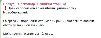 10.50 Утром от обстрел рф в Херсонской области погиб гражданский 59-летний мужчина в Новобериславе.