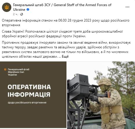 В четверг, 28 декабря, Генштаб ВСУ обнародовал сводку о ситуации на фронт за минувшие сутки.