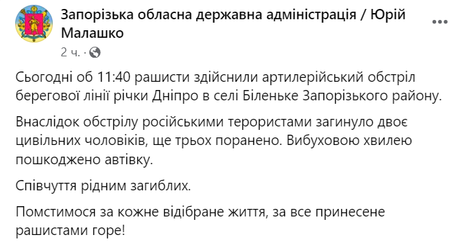 В результате обстрела села Беленькое Запорожской области погибли два человека, еще трое ранены.