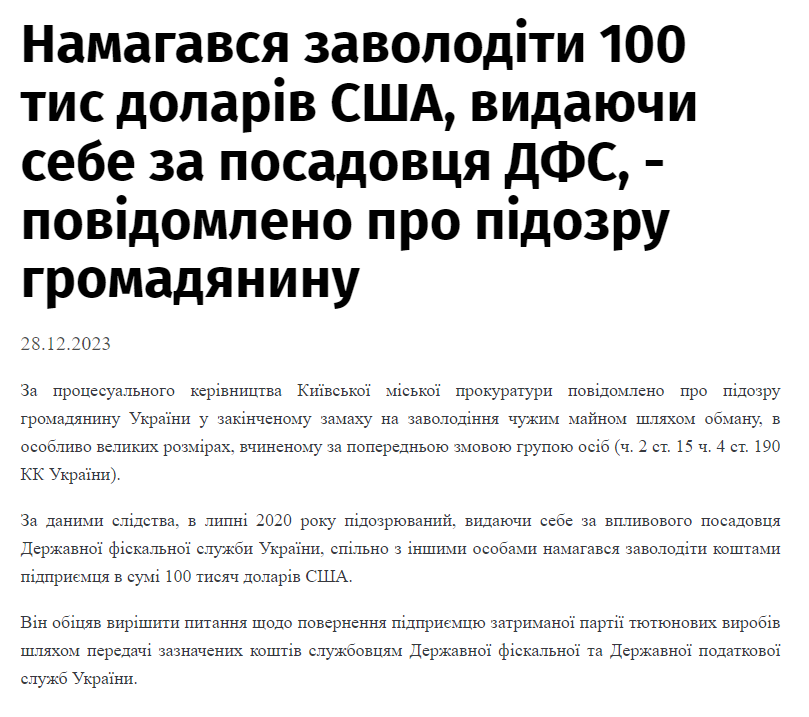В июле 2020 года следователи выяснили, что Червинский, выдающий себя за влиятельного чиновника фискальной службы, планировал с сообщниками захватить средства предпринимателя в размере 100 тысяч долларов.