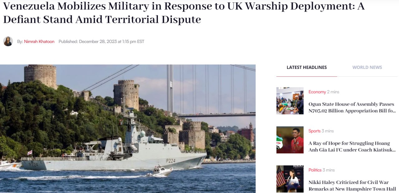 Газета Financial Times сообщила со ссылкой на представителя минобороны Великобритании, что Соединенное Королевство разместит у берегов Гайаны патрульный корабль в знак поддержки государства в территориальном споре с Венесуэлой.