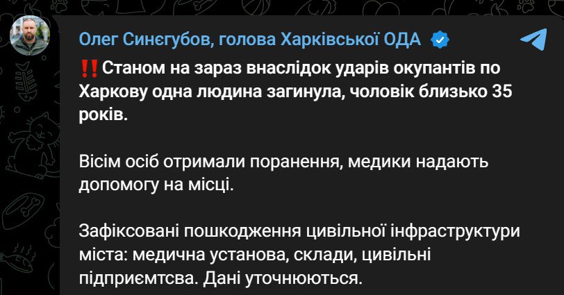 По его данным, Харьков обстреливают примерно с пяти часов утра, было около 12 прилетов. Возникли проблемы с подачей электричества для транспорта.