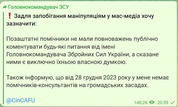 "Любые внештатные помощники не имели полномочий публично комментировать какие-либо вопросы от имени главнокомандующего Вооруженными силами Украины, а сказанное ими - является исключительно следствием личной жажды публичности", - отметили в Генштабе.