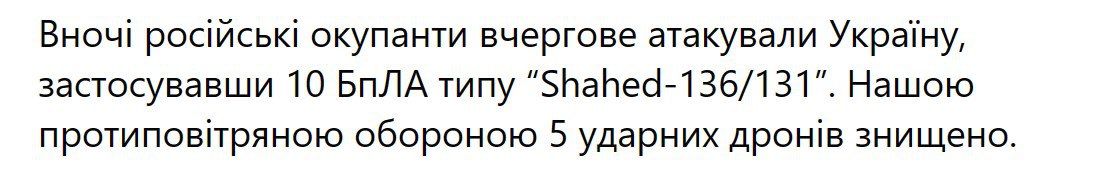 Генштаб в сводке сообщил, что россияне атаковали Украину десятью "Шахедами", пять из них сбила ПВО.
