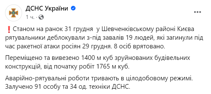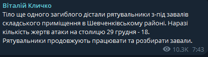 В Киеве уже 19 погибших в результате массированной атаки РФ 29 декабря. Сегодня утром из-под завалов складского помещения в Шевченковском районе достали тела еще двух жертв.
