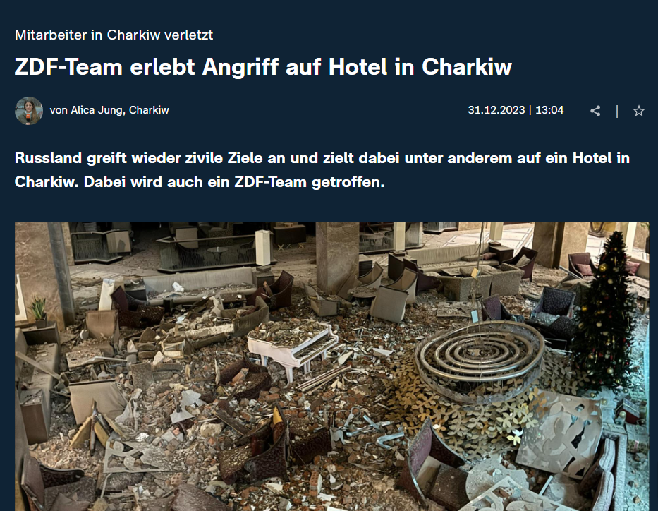 Журналисты немецкого телеканала ZDF пострадали в результате вечерней атаки РФ на Харьков. Семь сотрудников находились в гостинице "Kharkiv Palace" в момент удара.