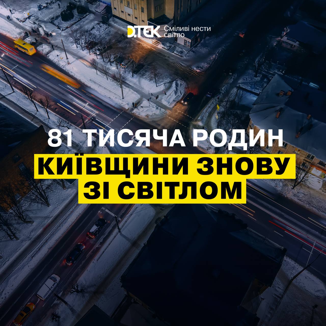 "Энергетики ДТЭК возобновили электроснабжение для 81 тысяч семей в Бучанском, Вышгородском и Фастовском районах. Работаем дальше, чтобы вернуть свет всем жителям Киевской области", - говорится в сообщении.