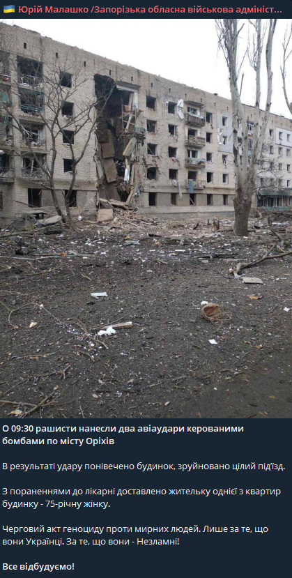 "В 09:30 рашисты нанесли два авиаудара управляемыми бомбами по городу Орехов. В результате удара изуродован дом, разрушен целый подъезд. С ранениями в больницу доставлена ​​жительница одной из квартир дома - 75-летняя женщина", - говорится в сообщении.