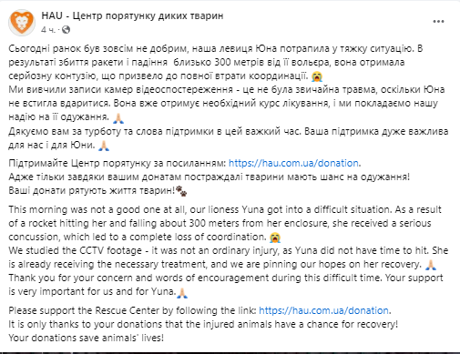 "Львица Юна попала в трудную ситуацию. В результате сбития ракеты и падения около 300 метров от ее вольера, она получила серьезную контузию, что привело к полной потере координации" - говорится в сообщении.