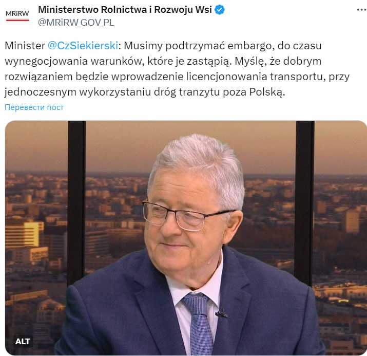 Об этом заявил министр сельского хозяйства и развития села Чеслав Секерский в интервью телеканалу TVP Info, его слова приводит аккаунт министерства в Х.