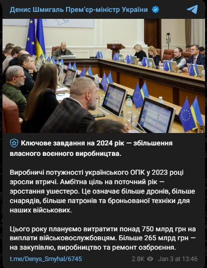 "Это означает больше дронов, больше снарядов, больше патронов и бронированной техники для наших военных. Входим в новый 2024 год с новыми силами. Уверенные в собственных возможностях и солидарности союзников, готовы к новым вызовам и твердо верим в нашу победу", - подчеркнул Шмыгаль.