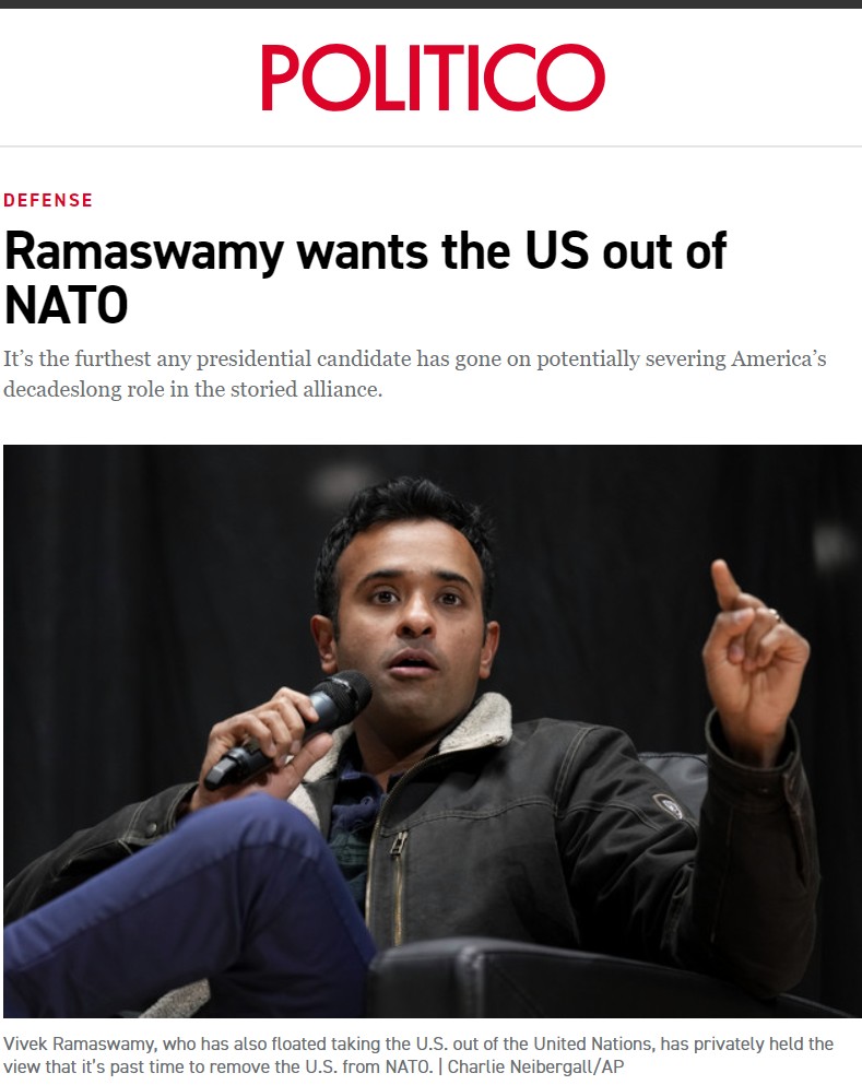 Кандидат от Республиканской партии Вивек Рамасвами заявил, что в случае победы на выборах выведет США из НАТО.