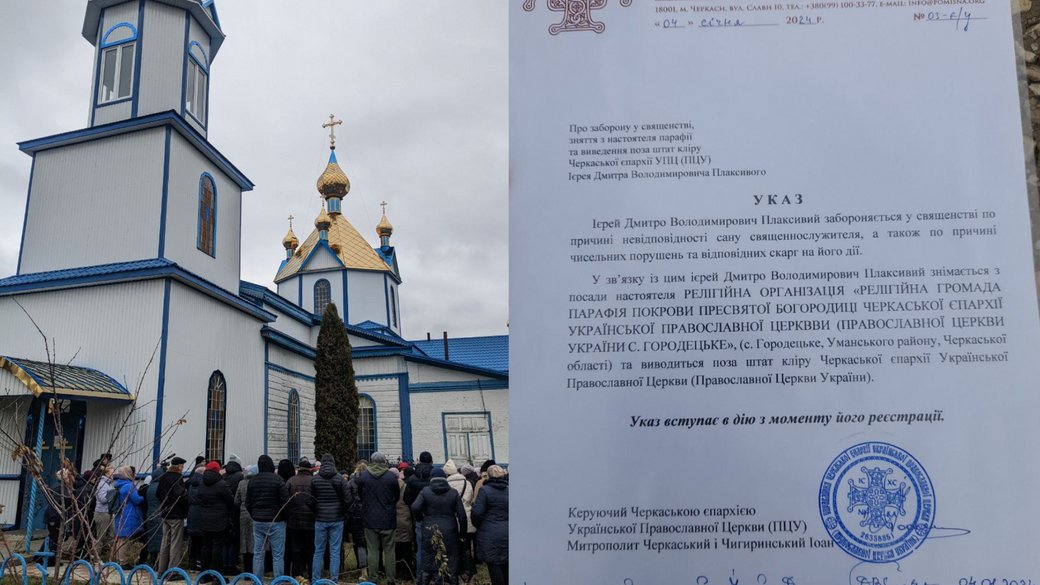 Журналистам удалось ознакомиться с указом руководителя Черкасской епархии ПЦУ митрополита Черкасского и Чигиринского Иоанна. Согласно документу, Плаксивому запрещено проводить богослужения. Его сняли с должности настоятеля религиозной организации "Религиозная община прихода покрова пресвятой Богородицы". Причиной отстранения названо "несоответствие сана священнослужителя, многочисленные нарушения и соответствующие жалобы на его действия".