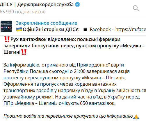 "Оформление и пропуск через границу грузовых транспортных средств в направлении въезда в Украину осуществляется в обычном режиме. В настоящее время въезда в Украину перед КП "Медыка – Шегини" ожидают 650 грузовиков", - сообщает ведомство.