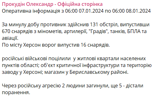 Глава ОВА добавил, что за сутки в Херсонской области зафиксирован 131 обстрел, россияне выпустили 670 снарядов из минометов, артиллерии, "Градов", танков, БПЛА и авиации. Погибли два человека, еще пятеро - получили ранения.