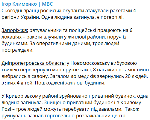 Днепропетровская область: в Новомосковске взрывной волной перевернуло маршрутное такси, восемь пассажиров самостоятельно выбрались из салона. В общей сложности к медикам обратились 20 человек, из которых четверо детей. Повреждены жилые дома. В Криворожском районе разрушен частный дом, один человек погиб. Уничтожен частный дом и в Кривом Роге – три человека могут находиться под завалами. Также разрушениям подвергся торгово-развлекательный центр.