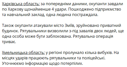 Харьковская область: по предварительным данным, оккупанты нанесли по Харькову минимум четыре удара. Повреждены предприятие и учебное заведение, один человек пострадал. Также оккупанты атаковали город Змиев Чугуевского района, разрушен частный дом. Спасатели освободили из-под завалов двух человек, еще один человек может находиться под завалами. Спасательная операция продолжается.