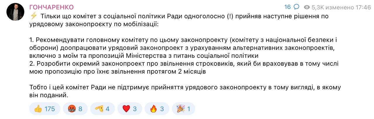 Об этом сообщил народный депутат Алексей Гончаренко в своем телеграм-канале.