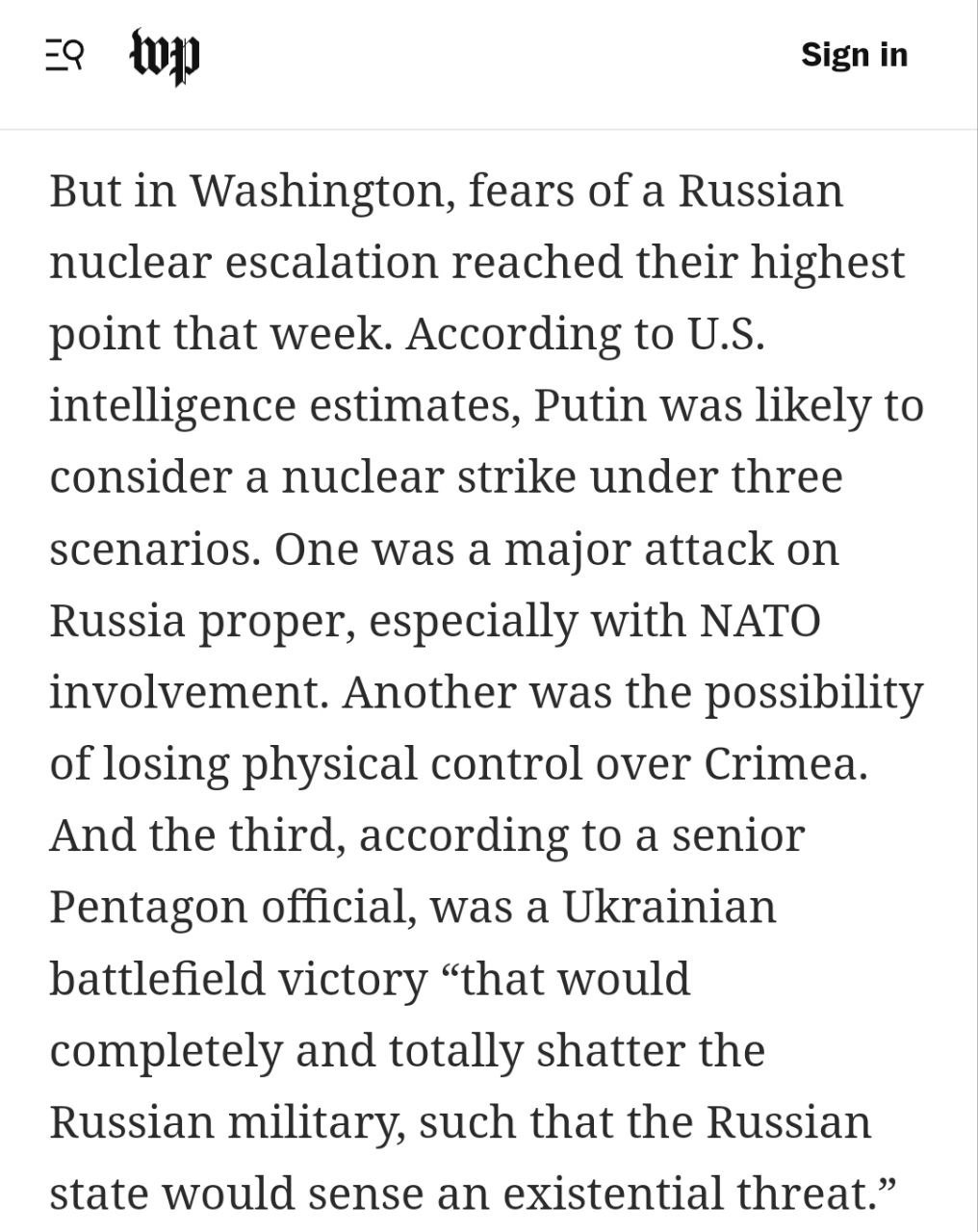 Согласно третьему сценарию, по словам высокопоставленного чиновника разведки США, ядерный удар должен был быть нанесён Москвой в случае победы Украины на поле боя, "которая полностью разгромила бы российскую армию, и российские власти почувствовали бы экзистенциальную угрозу".