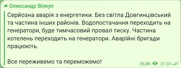«Водоснабжение переходит на генераторы, будет временный провал давления. Часть котельных переходит на генераторы. Аварийные бригады работают», – написал Вилкул.
