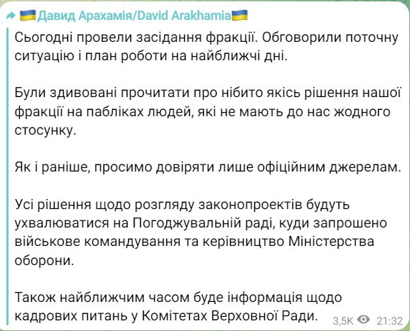 «Сегодня провели заседание фракции. Обсудили текущую ситуацию и план работы на ближайшие дни. Были удивлены прочитать якобы какие-то решения нашей фракции на пабликах людей, не имеющих к нам никакого отношения», – заявил Арахамия.