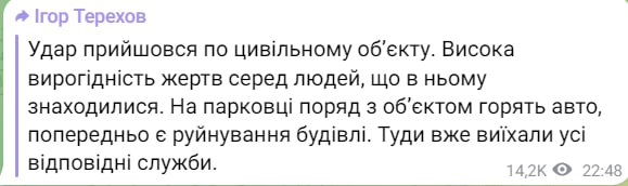 22:54 В Харькове ракетный удар пришелся по гражданскому объекту, сообщил мэр города Терехов.