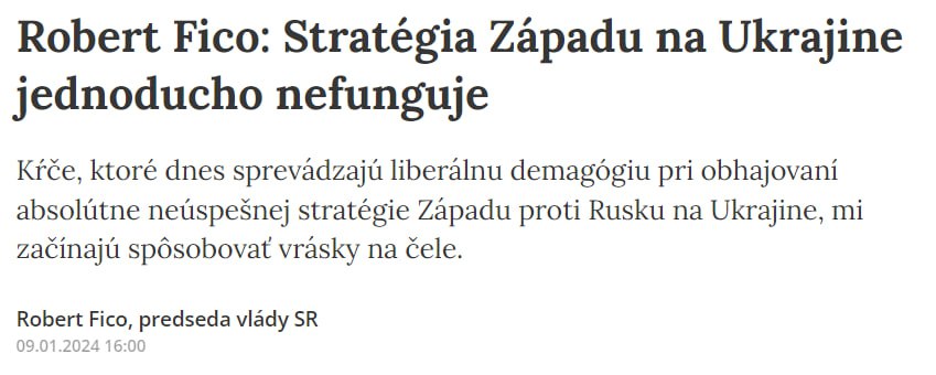 По его словам, западая стратегия по ослаблению России провалилась. С позиции Фицо, она состояла в том, что "украинский солдат принесет российскую медвежью голову на блюде в виде истощенной в военном отношении, экономически разоренной, международно-изолированной и внутренне политически ниспровергнутой России".