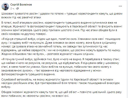"Я почувствовал страшный взрыв, следом еще один, полетели стекла. Осколками стекла мне повредило руку. И я сразу выбежал на улицу. Очень испугался за свою коллегу, она была в соседнем номере. Это дерзкая атака на обычный отель, мы всегда там останавливались во время командировок, это почти центр города, и мы не ожидали, что россияне могут ударить по нему. Никаких военных там не было", - сообщил журналист.