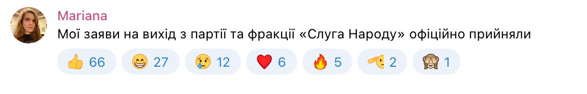 "Мои заявления о выходе из партии и фракции "Слуга народа" официально приняты", - говорится в сообщении.