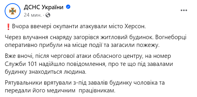 10:00 Вчера вечером российские войска атаковали город Херсон. В результате обстрела загорелся жилой дом, из-под завалов спасли мужчину.
