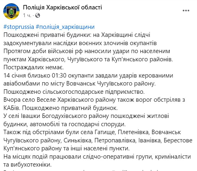 "14 января около 01:30 оккупанты нанесли удары управляемыми авиабомбами по городу Волчанск Чугуевского района. Повреждено сельскохозяйственное предприятие", - говорится в сообщении.