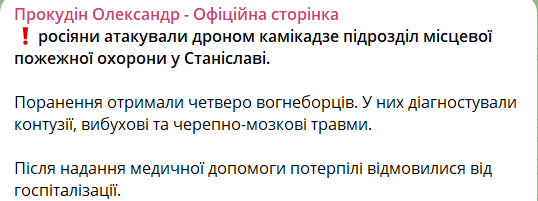 "Россияне атаковали дроном-камикадзе подразделение местной пожарной охраны в Станиславе.