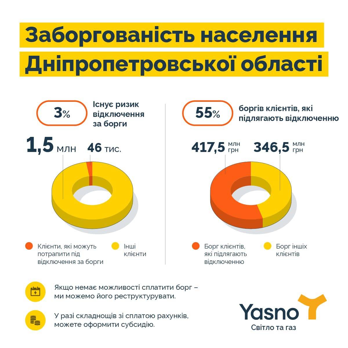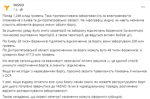 "Более 1,246 млрд. гривен. Такова просроченная задолженность по электроэнергии потребителей из Киева и Днепропетровской области. На инфографике видно, что даже незначительное количество абонентов формирует значительные объемы долга" - заявили в компании.