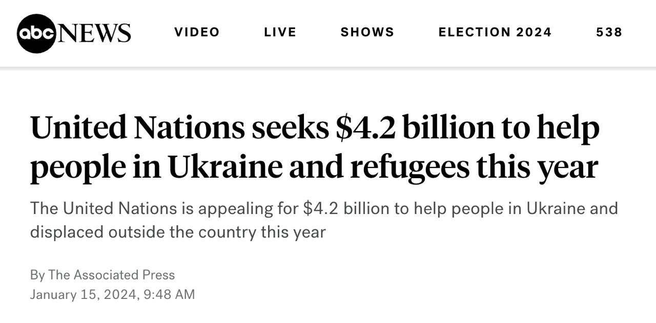 Поэтому Организация Объединенных Наций в этом году запросит 4,2 млрд долларов для помощи украинцам: 3,1 млрд для людей в Украине, 1,1 млрд - для беженцев в соседних странах.