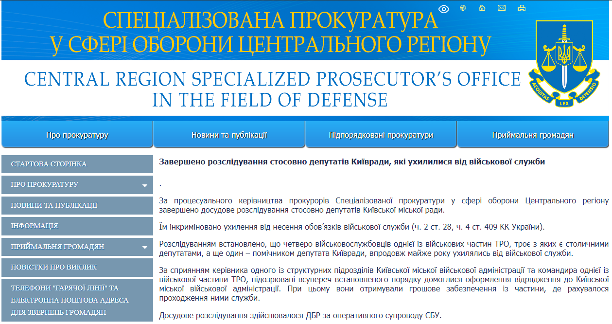 По данным следствия, три депутата Киевсовета и один помощник были военными ТРО, но получили командировку в Киевскую военную государственную администрацию, продолжая почти год получать зарплату военных.