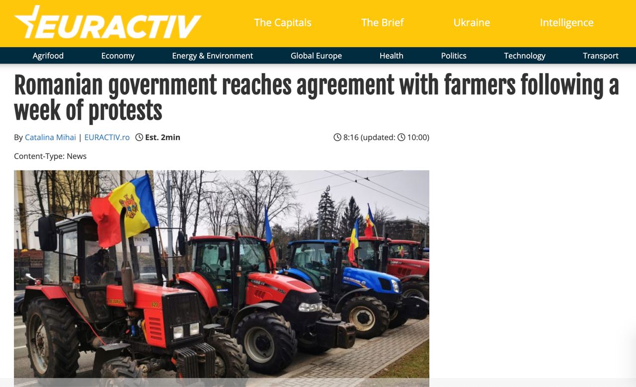 Местный министр сельского хозяйства Флорин Барбу сообщил, что после недели протестов они договорились по 13 требованиям фермеров. Обсуждения по остальным пунктам будут продолжены, до тех пор протесты будут продолжаться.