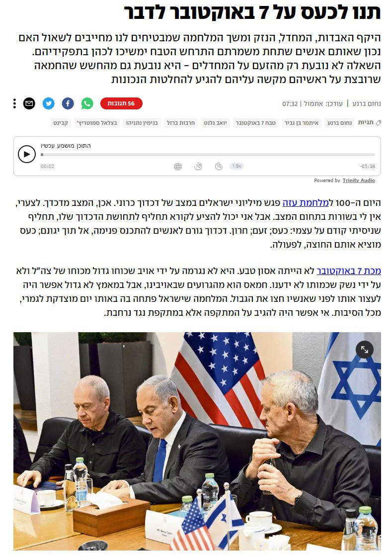 "Масштабы потерь, упущения, ущерб и продолжительность войны, которые обещают нам, заставляют со всей серьезностью спросить, правильно ли, чтобы те же самые люди, по чьей вине происходили события 7 октября, продолжали служить на своих должностях?", - задается вопросом журналист, имея в виду правительство Нетаньяху.