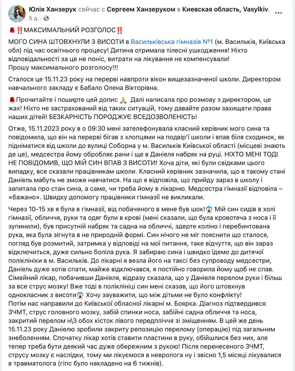 Мама заявляет, что ни руководство гимназии, ни преподаватели, ни родители мальчика, который толкнул ее сына, не хотят брать на себя ответственность и возмещать ущерб и затраты на лечение.