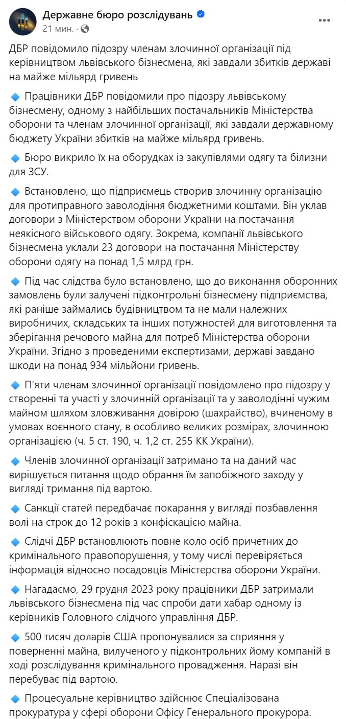Новое дело касается возможной коррупции на оборонных тендерах. Ущерб при закупке у него государством одежды и белья для ВСУ оценивается в почти миллиард гривен.