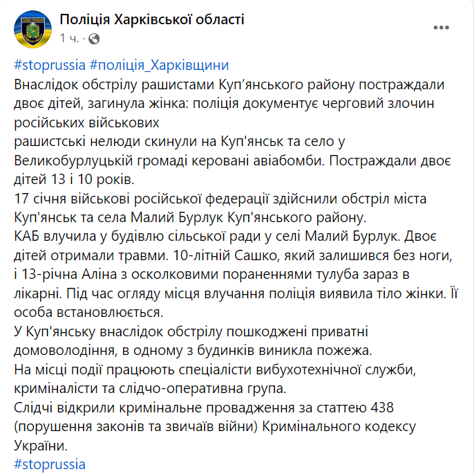 Сегодня российские военные ударили по Купянску и селу Малый Бурлук Харьковской области управляемыми авиабомбами. В результате обстрела погибла женщина, пострадали двое детей 13 и 10 лет.