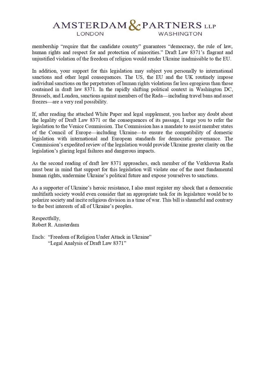 "Ваша поддержка этого законодательства может привести вас лично к международным санкциям и другим правовым последствиям. В быстро меняющемся политическом контексте в Вашингтоне, Брюсселе и Лондоне санкции против членов Рады, включая запрет на поездки и замораживание активов, вполне реальны. Как сторонник героической борьбы Украины я должен отметить свой шок от того, что законодательство, поляризующее общество и разжигающее религиозный раскол во время войны, может рассматриваться в демократическом многоконфессиональном обществе. Этот законопроект позорен и противоречит интересам всего народа Украины", - написал спикеру Рады и его заместителям Роберт Амстердам.