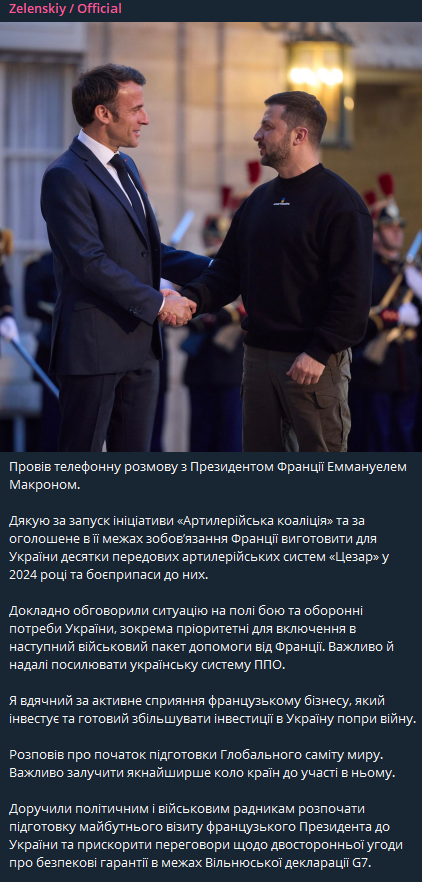 В разговоре Зеленский поблагодарил за запуск инициативы "Артиллерийская коалиция" и за объявленное в ее рамках обязательство изготовить для Украины десятки артиллерийских систем "Цезарь" в 2024 году и боеприпасы к ним.