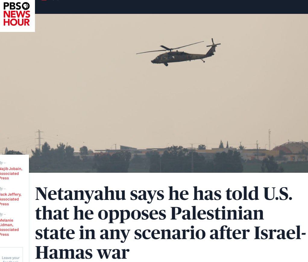 Премьер-министр Израиля Биньямин Нетаньяху заявил официальным лицам США, что он будет выступать против создания палестинского государства в любом послевоенном сценарии.